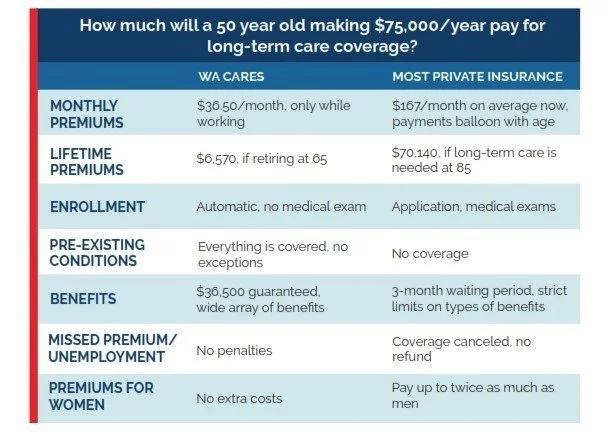 With Washington’s program, all workers are enrolled and after vesting, can access their benefits anytime they need help due to illness, injury, or aging. We can even use our benefits to pay a family member to care for us, which is not allowed by private insurers.